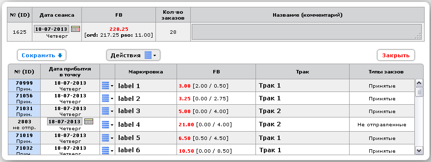 - Мастер-клиенты, которые размещают заказы на большое количество подклиентов, могут работать с сеансами. Сеанс – это просто группа из нескольких заказов, объединенных в визуальный блок. Например, если планируется работа с несколькими заказами на прибытие в точку в один день недели, то удобно будет их объединить в группу, и уже затем обрабатывать заказы в рамках этой группы (сеанс заказов). Сеанс также удобен массовыми операциями, например, нескольким заказам группы можно легко проставить нужную дату прибытия в точку или трак.