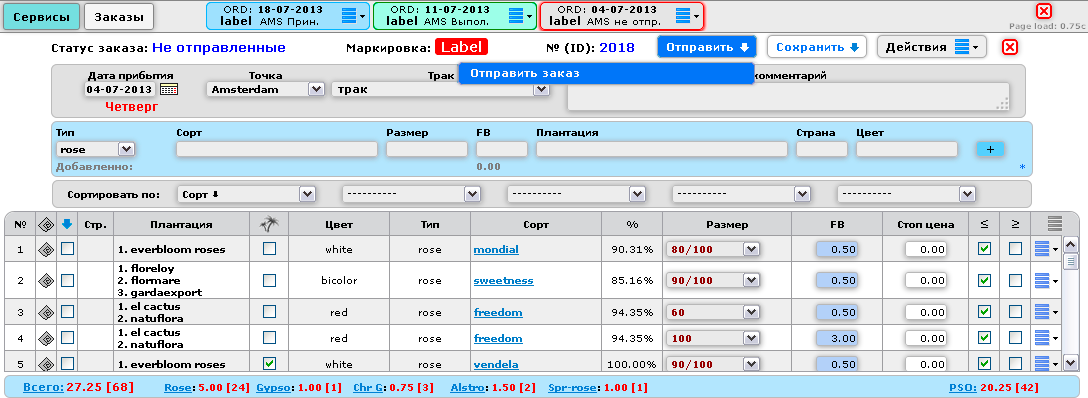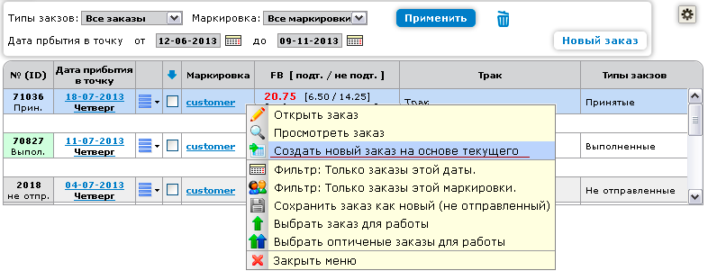 Самый простой способ создать новый заказ – открыть таблицу заказов и выбрать один из «Выполненных», который по содержимому и количеству будет наиболее похож на заказ, который предполагается отправить. Правый клик на строке заказа – выбрать функцию «Создать новый заказ на основе текущего».